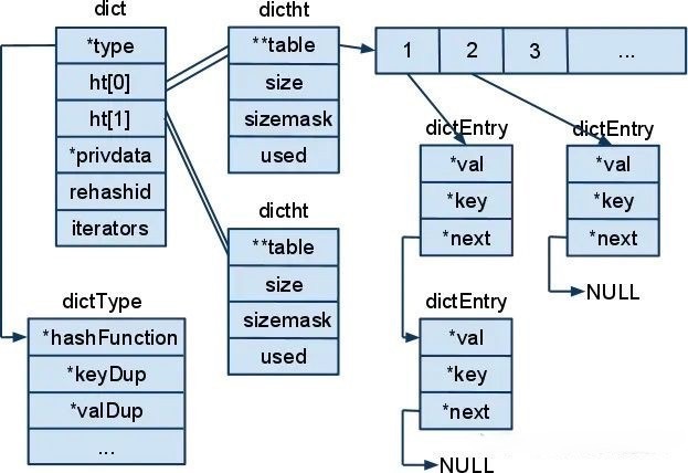 Redis的哈希表实现其实是字典,一个字典中包含了两个哈希表。一个哈希表里面可以有多个槽,而每个槽保存了一个键值对(或者多个,取决于是否有哈希冲突)。