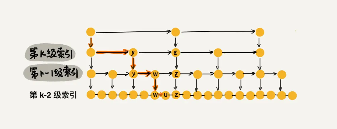 它的基本思想是在链表的基础上,增加多级索引,从而提高数据的查找效率。在一般情况下,它的查找、插入、删除等操作的时间复杂度都为O(log n)。