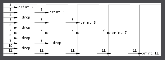 更正式地描述:每个进程都从左边得到一个数。进程将得到的第一个数(记作A)输出,然后持续从左边拿到一个数(记作A_k)进行判断。如果Ak被A整除了,那么A_k不是质数,丢弃。否则将A_k传递给下一个进程。第一个进程的输出是所有数字(2~N,N取决于你想要的素质范围)。
