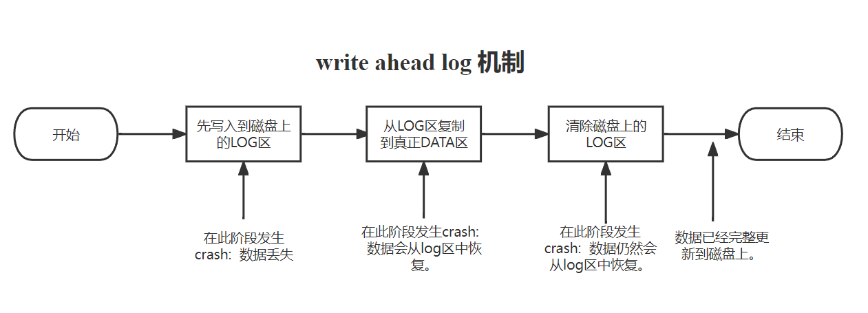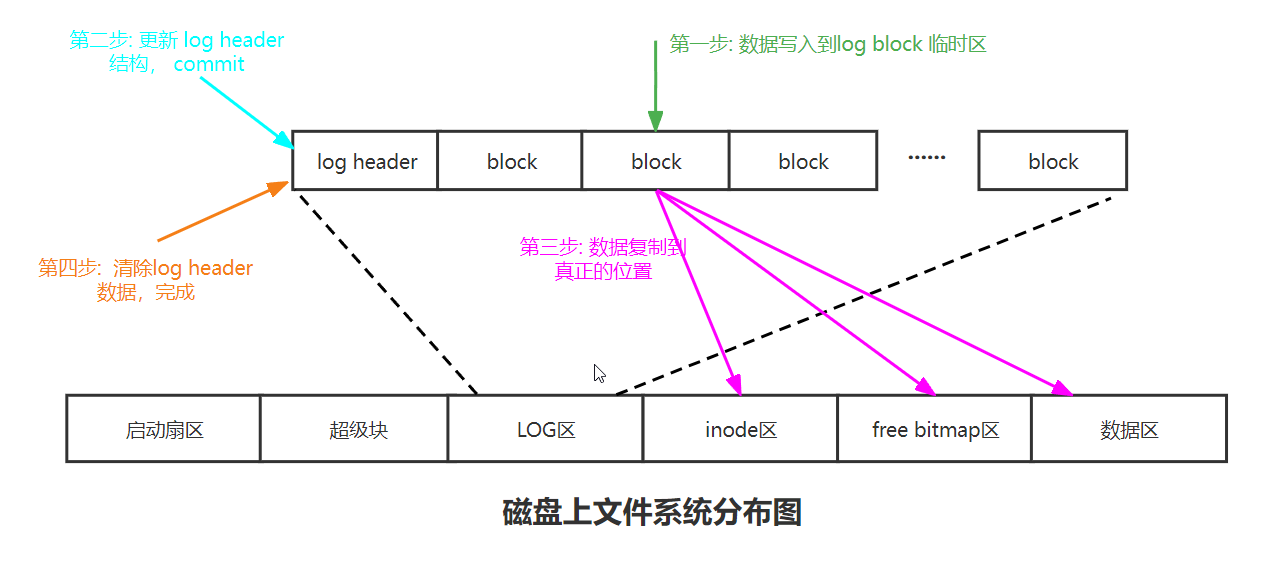 简单来说:就是系统调用先写log区,log区写完后写一条提交记录。提交记录写完,再将log区的block搬回到data区,搬运完之后擦除磁盘的日志。