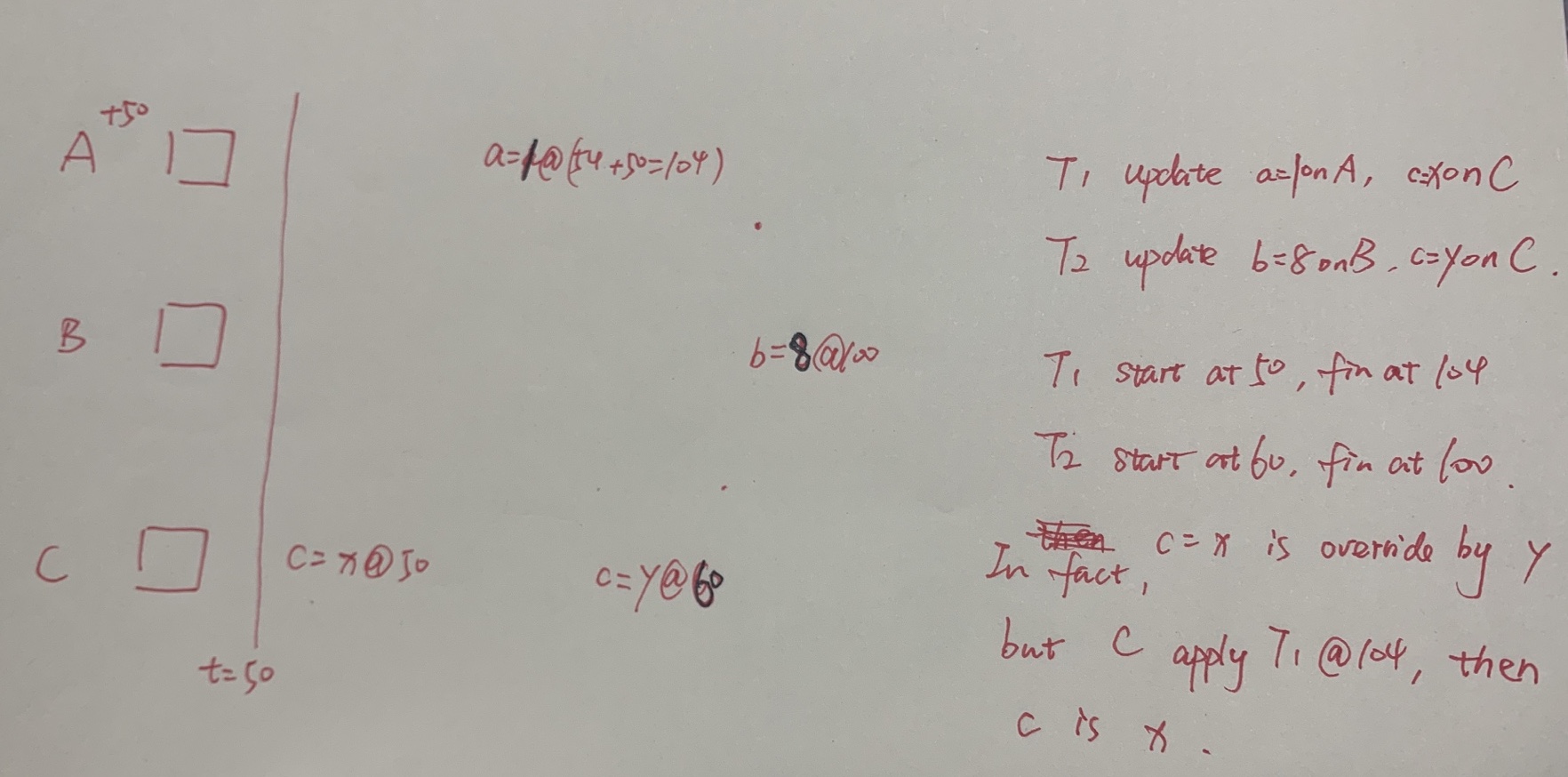 假设有3台机器ABC,A的时间戳快50,BC正常。事务T1更新A和C机器上的值,事务T2更新B和C机器上的值。以2PC为例,T1在时间50开始,协调者得到A=104(实际上为54)和C=50的回复,那么协调者就会选104作为提交时间戳,发起提交请求。T2在时间60开始,协调者得到B=100和C=60的回复,那么协调者就会选100作为提交时间戳,发起提交请求。然后C机器上,就会认为T2比T1先完成,T2的改变就会被覆盖,实际上T2晚于T1。