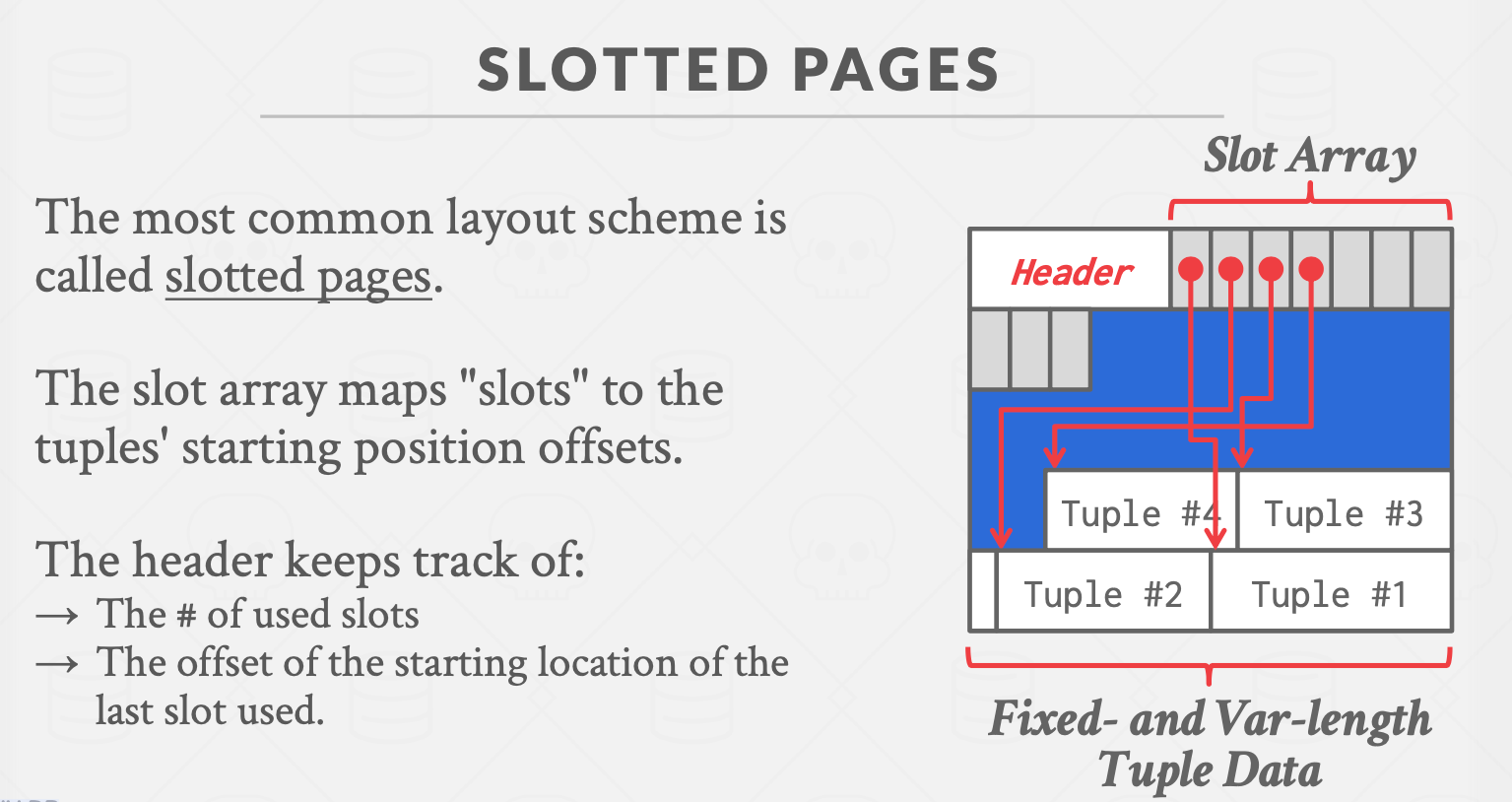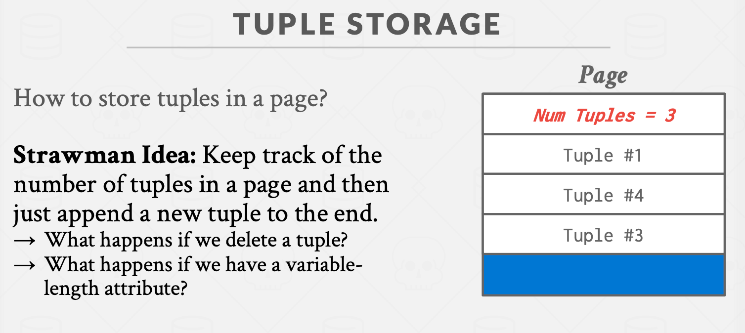基于元组的存储,将一堆tuple放在一起。只能应对固定长度的tuple,无法很好应对删除操作(破坏顺序,内存碎片)。