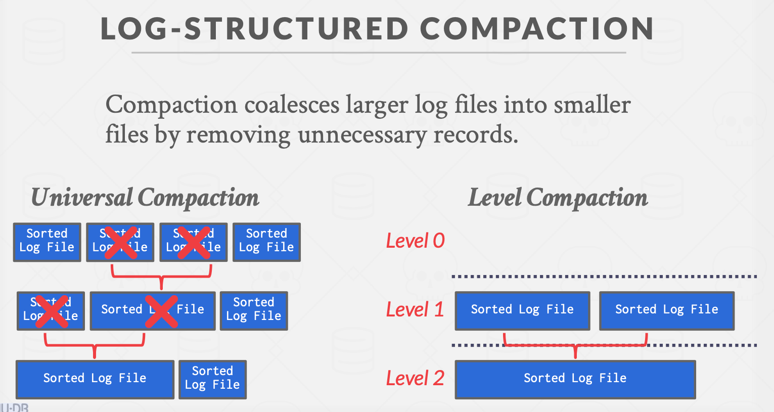 由于日志页会越来越大,通常需要进行日志压缩操作,即将若干个页里冗余的操作合并在一起。合并后还可以根据Tuple的ID进行排序,以便进行更好的读取。那么,这就是Sorted String Tables(SSTables)的思想。