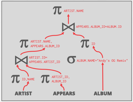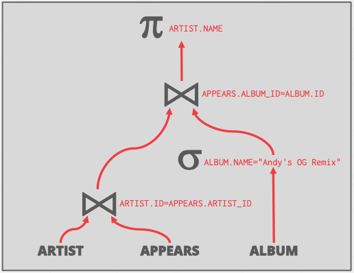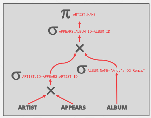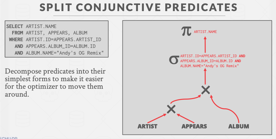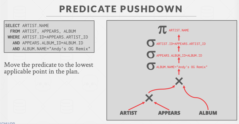 如下两图所示,原本artist和appears需要先做笛卡尔积再进行谓词筛选,但是这个操作可以转化为连接。因为DBMS对于Join有多种优化方式(Loop join、sort-merge join和hash join等)。