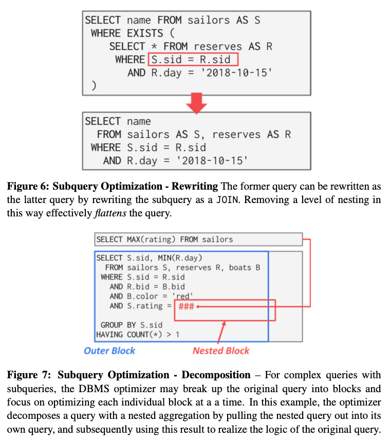 在一些复杂的查询当中,可能不太容易将内部的子查询和外部的主查询rewrite成一个查询,那么DBMS可以将子查询分离出来,先把子查询做完,把结果存放在一个临时的表里面,然后把这个临时的表带到主查询中。这里的解耦是指:不让子查询嵌套在主查询里面,而是把它拿出来,提前执行它。