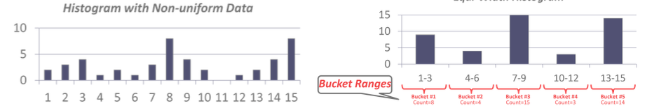 对于不均匀分布/attribute之间不独立的数据,可以利用直方图记录信息。