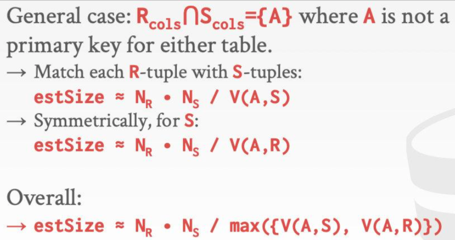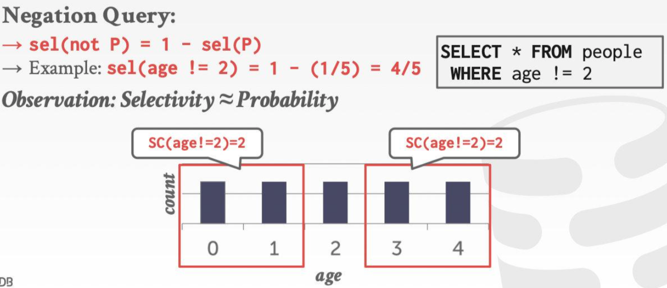 对于每张表R,DBMS追踪表中tuple的数量$N_R$以及每个attribute A的distinct value的数量$V(A,R)$。selection cardinality选择基数由 $SC(A, R)=\frac{N_R}{V(N,R)} $ 计算得出。