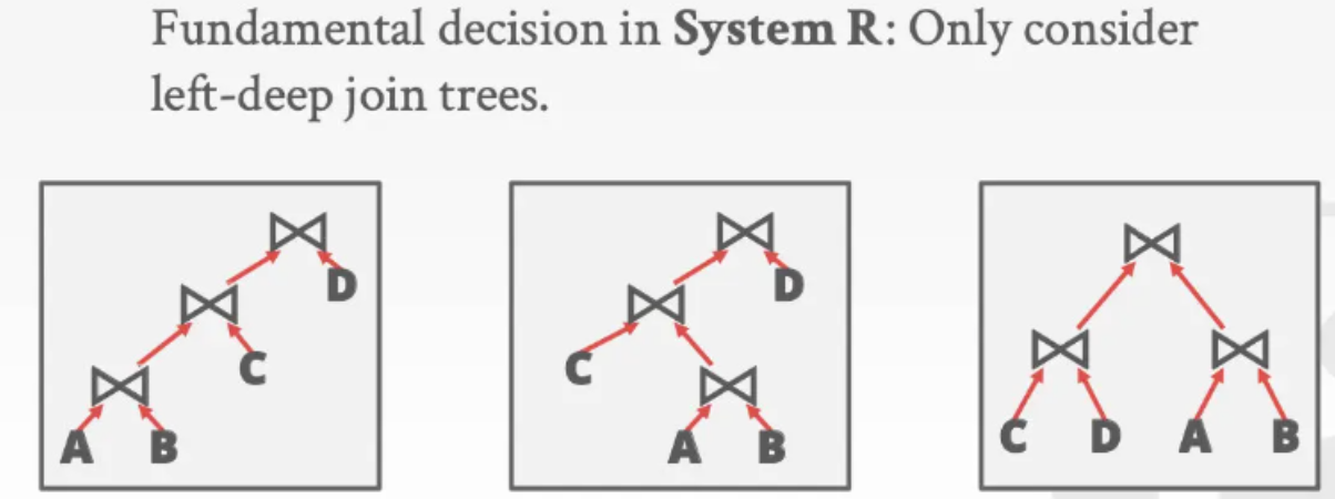 IBM的System R只考虑左深树对应的join排列,即join的左子树也是一个join操作(如下图最左侧所示,因此下图的右边两个join排列都会被pass掉)。