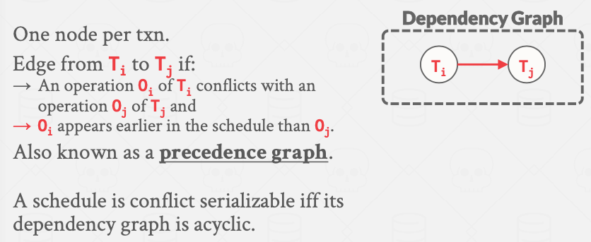 如果一对冲突操作中Ti事务里的0i操作先于Tj事务里的0j操作执行,那么就在依赖图中画从Ti指向Tj的一条有向边。