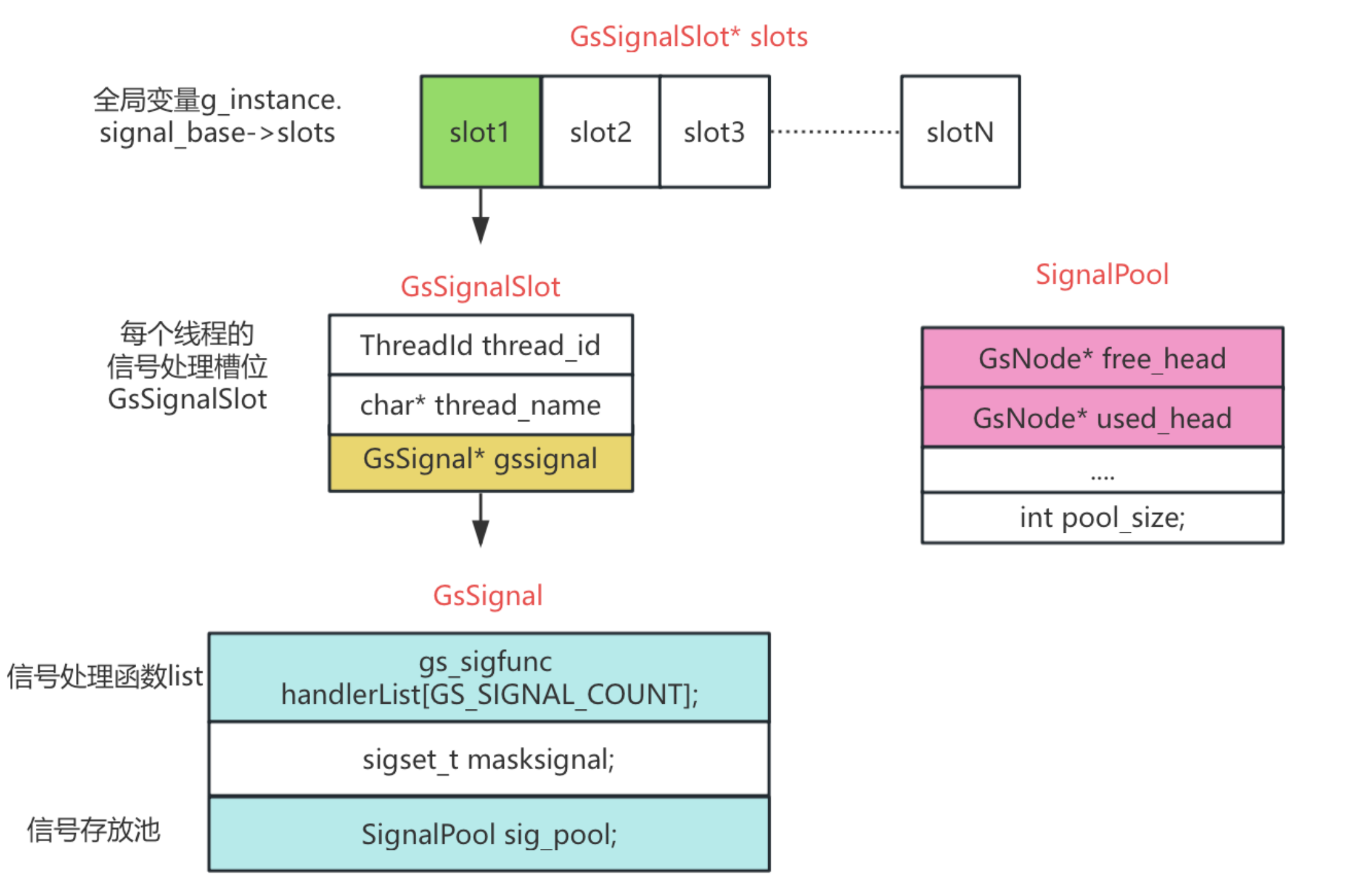 GsSignalSlot中重要的是 GsSignal ,它描述了一个线程怎么处理信号 gs_sigfunc 以及线程要处理的信号 SignalPool