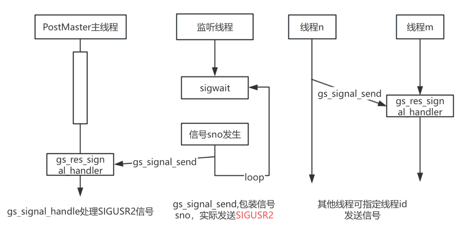 注意:gs_signal_send 发送的信号始终是 RES_SIGNAL 即 SIGUSR2 ,那么对应线程的处理则由gs_signal_handle函数进行!